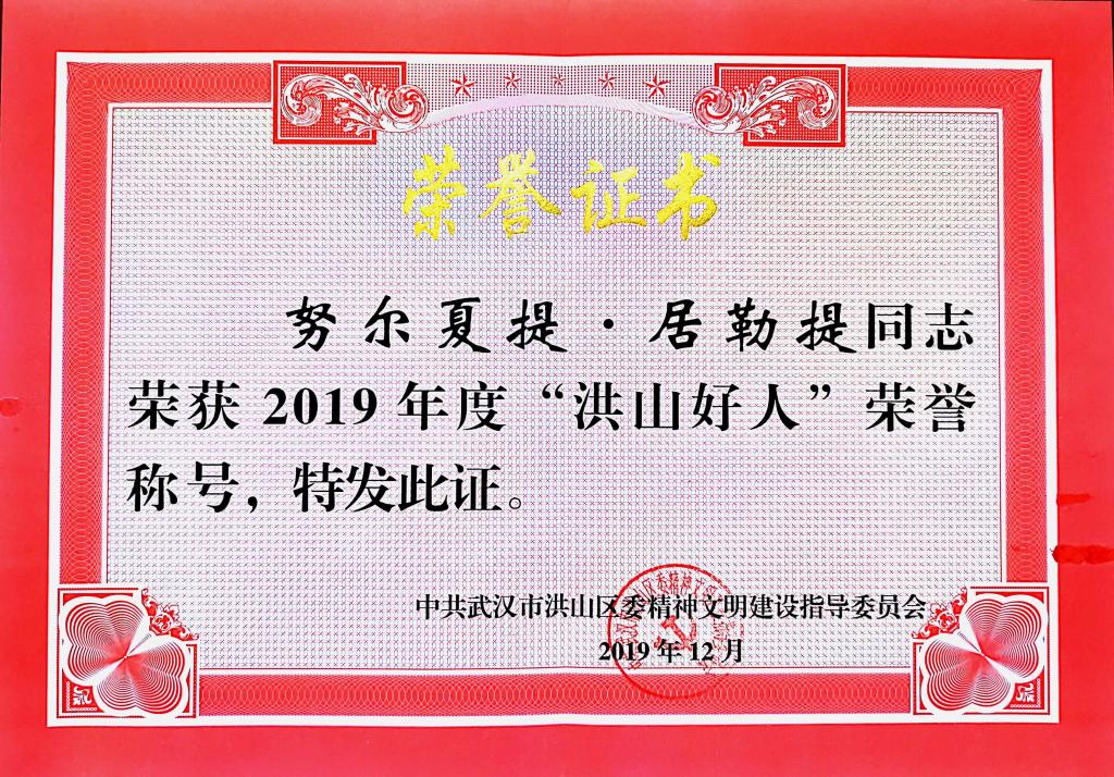 2019年度“洪山好人”评选结果近日揭晓,我院辅导员努尔夏提·居勒提入选敬业奉献好人评选,荣获“洪山好人”荣誉称号。据了解,2019年洪山区委宣传部、区委文明办等部门联合组织开启第六届寻找“洪山好人”活动,广泛发动辖区单位和群众推荐了220名人选,经过前期筛选和提炼,层层推荐和评委审定,45位(包含3个团队)身边的好人带着他们的感人事迹又一次进入大众视野。