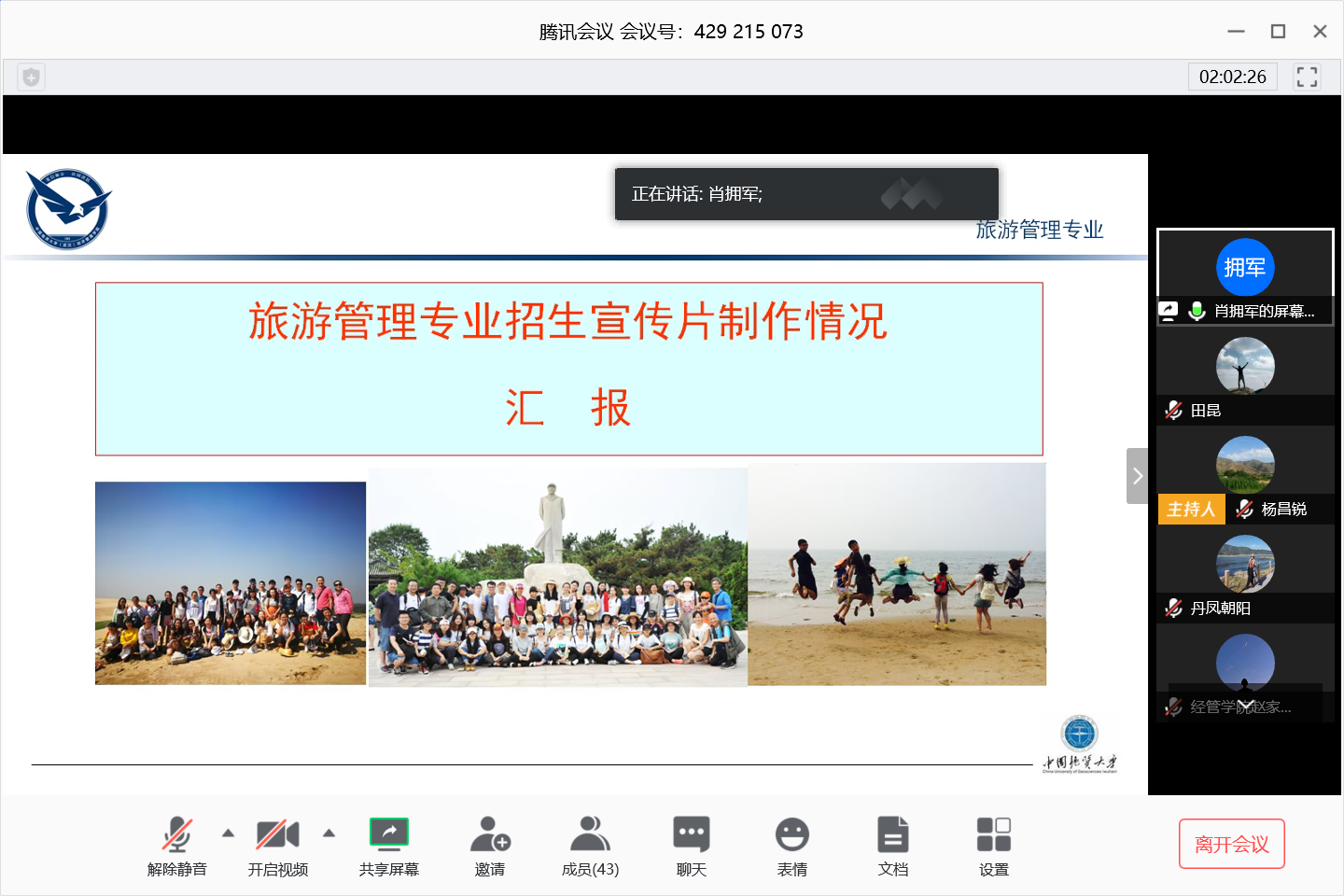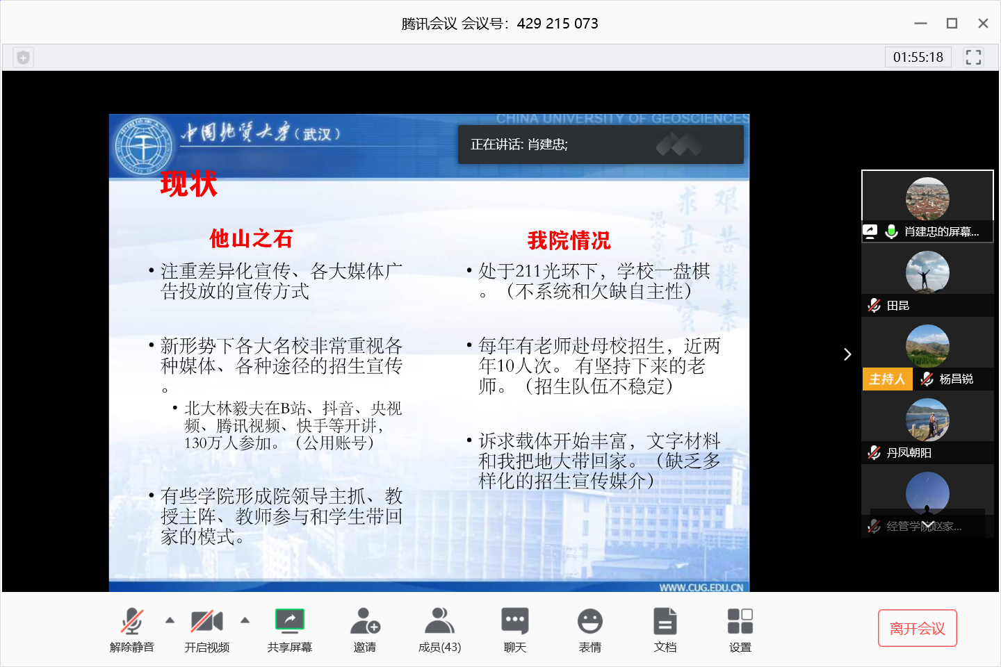 肖拥军和宫培松两位老师分别介绍了旅游管理和工程管理两个专业招生宣传视频的制作经验。肖拥军分享了视频制作的方法和流程,提醒各系要结合MOOC制作经验,边思考边总结边制做。宫培松强调制作过程中应注意脚本、素材和创意,建议在全院范围内组织立项,制作不同角度的宣传视频,让学生参与视频制作,吸引高中生关注。