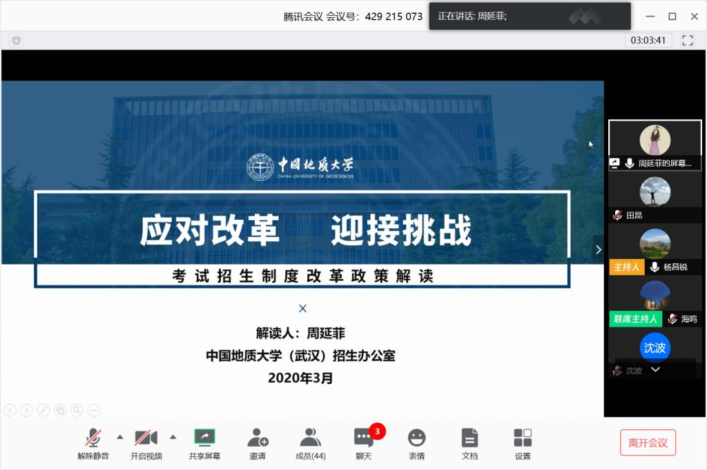 学校招生办公室主任周延菲应邀出席会议。她讲解了新高考和传统高考的区别,详细阐述了高考改革的方向和政策,提出高考改革给高校带来的挑战主要有两个方面,一是科目组合的不同给生源结构带来的变化;二是报考录取方式的不同给生源质量带来的变化。