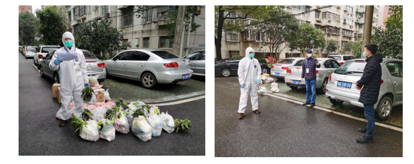 (左:刘耕老师正在分发居民订购物资 右:刘勇胜校长视察慰问)