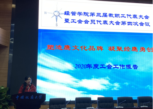 经管分工会主席王萍同志作《塑造鹰文化品牌 凝聚经鹰勇创新—2020年amjs澳金沙门工会工作报告》,报告从职工教育、文化建设、民主建设和权益福利四个方面总结了2020 年度学院工会工作。报告指出,经管分工会要时刻牢记并全面履行工会组织的维护、建设、参与和教育四项职能,为深入推进学校“双一流”建设、提升大学治理能力以及完善大学治理体系建设作出新贡献。
