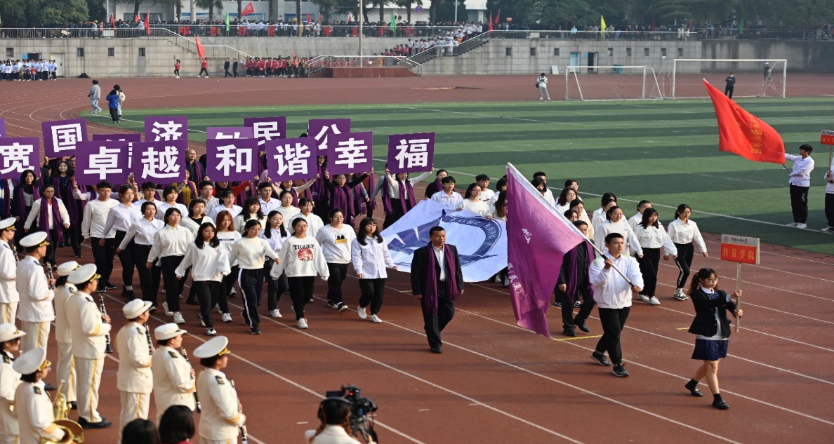在10月29日的开幕式上,在书记和院长的带领下,由我院师生组成的amjs澳金沙门方阵步伐稳健,昂首阔步走过主席台,亮相全校师生。“卓越、和谐、幸福”的院风,凝聚人心;“宽信敏公,经国济民,地大精鹰,长空万里”的口号,铿锵有力,响彻南望山,展现了经管人的家国情怀。