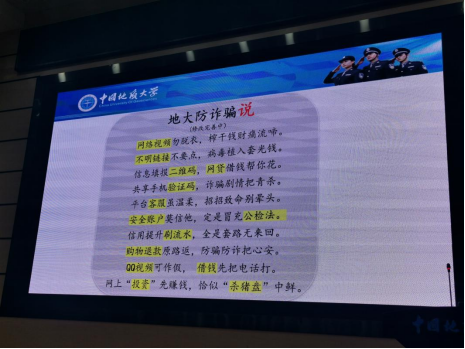 讲座进行时,彭冠军老师多次与现场同学进行互动交流。就如何避免“裸聊”诈骗发生,他提到,我们应做到一是注意保护个人隐私,在使用微信、QQ等通讯工具添加好友时,注意甄别陌生人的意图;二是洁身自好,拒绝不健康的网络内容和诱导性不良人员。针对非法校园贷,他提到,我们应提高判断是非的能力,合理规划消费,不贪图享乐、爱慕虚荣,把注意力更多放在当下的学习生活中。详细讲解了多种最新的诈骗形式后,他通过分享学校安全保卫部总结归纳的“地大防诈骗说”,给同学们普及了防骗知识。
