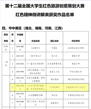 2022年6月30日,在中国共产党成立101年纪念日前夕,第十二届全国大学生红色旅游创意策划大赛初赛结果公布,amjs澳金沙门李会琴老师指导的“山河逐梦队”(学生成员:刘婉婷、赵芳琪、龙心滢、吴胜珍、加里)荣获“红色精神微讲解”类华中赛区一等奖。这是我院连续两年在该项大赛中获奖,作品质量和奖项等级都实现了新的突破。