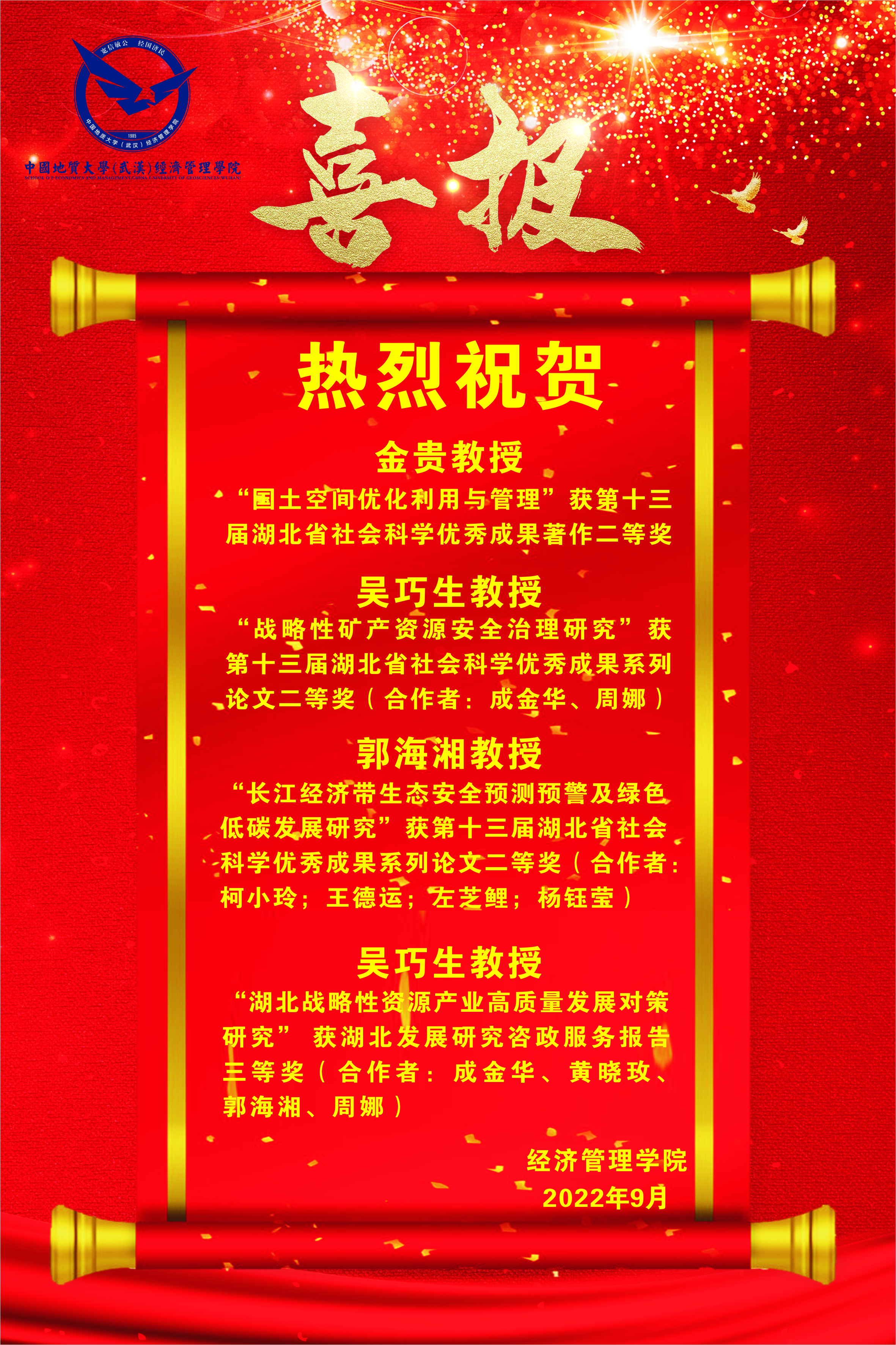 近日,第十三届湖北省社会科学优秀成果奖获奖名单和湖北省发展研究奖(2020—2021年)获奖名单公布,学校共获得一等奖1项,二等奖4项,三等奖5项。其中,我院吴巧生教授、金贵教授、郭海湘教授分别获第十三届湖北省社会科学优秀成果二等奖,吴巧生教授获湖北发展研究三等奖。