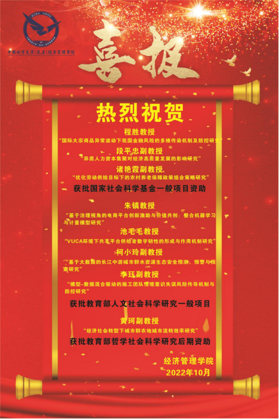 日前,全国哲学社会科学工作办公室发布了“2022年国家社会科学基金年度项目和青年项目立项结果公布”,学校6项获批国家社会科学基金一般项目资助,我院3个项目获批资助。