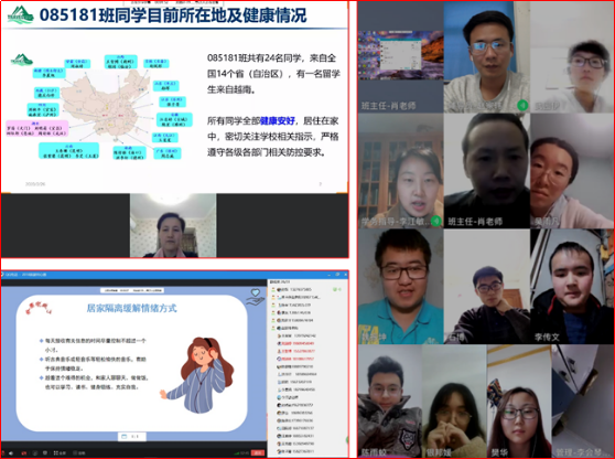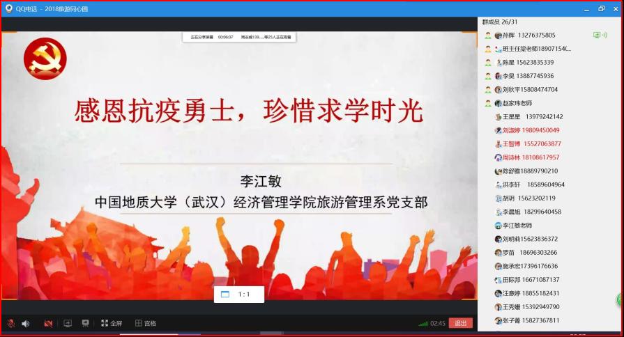 如何在疫情期间让班会充满温度、催人振奋,旅游管理系所有老师们和同学们尽心尽力、用情用爱共同为这场班会注入了温暖和信心。085171班的班主任庄小丽老师反复叮嘱学生“无论是身体、学业、心理还是生活上的问题和烦恼都能跟老师说,老师的‘一线’就是学生。”;“085181班的来自全国14个省(自治区)的23名学生和1名来自越南的留学生,共24名学生全部健康安好….”,梁玥琳老师对于班级所有学生的当前所处位置、身心健康状况都掌握得十分清楚,她说“最大的幸福就是我所有的学生都平平安安。等到疫情消散,回到课堂,跟大家互道平安!”;08S197班的班主任肖拥军老师鼓励学生:“除了党和国家的守护,地大母校、经管母院、全体老师,都在坚守岗位,做大家坚实的后盾。”他的话让学生深深地感到安心;李江敏老师则为大家的专业自信注入满满能量:“我们的专业在疫情之后必将是机遇大于挑战,愿我们能用旅游管理的专业知识讲好武汉抗击疫情的伟大动人故事!”除此之外,“仿佛一夜之间长大了”的学生们让班会变得更加温暖和充满活力,班长和团支书们认真的组织筹备、同学们争相报备平安、相互关爱鼓励问候、爱意满满的“心理辅导课”、心怀感恩的见闻分享….此情此景,让老师们放心,更让所有同学暖心。