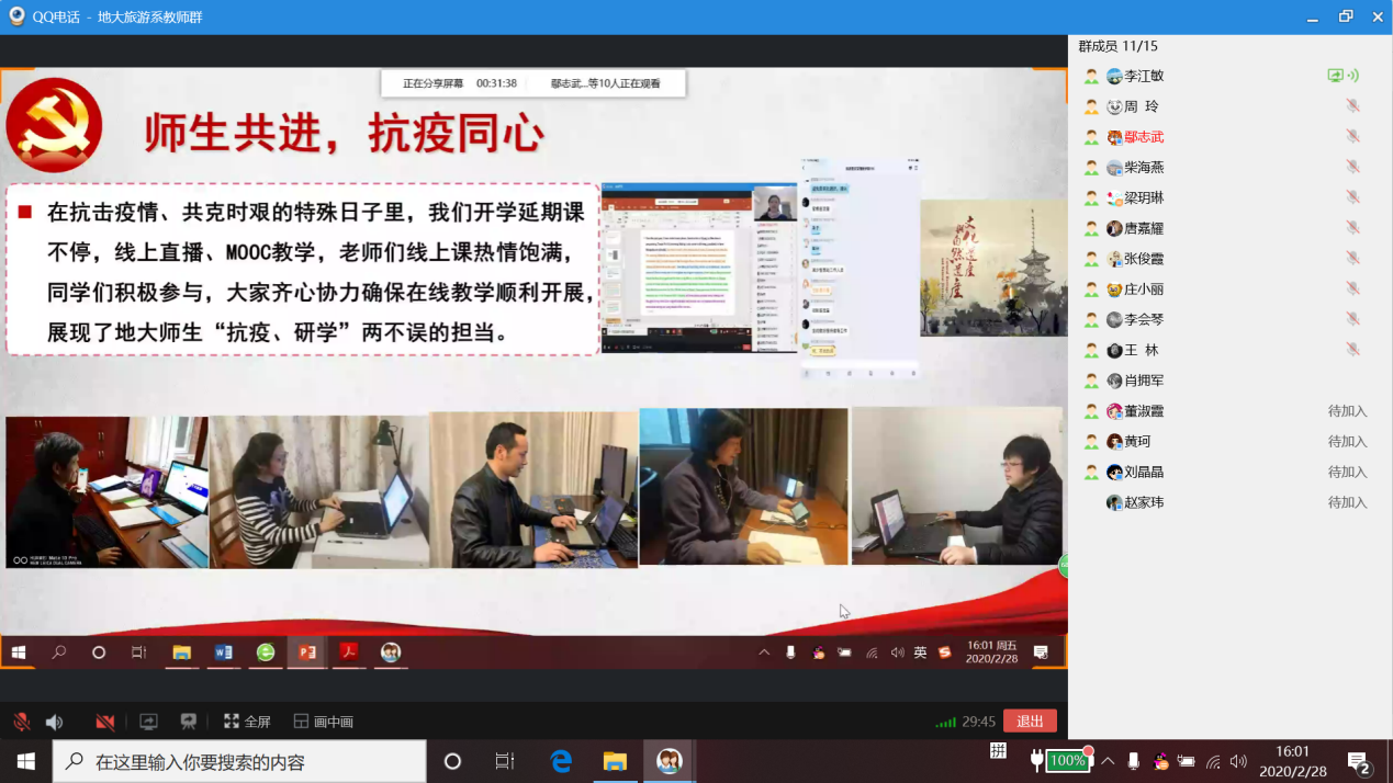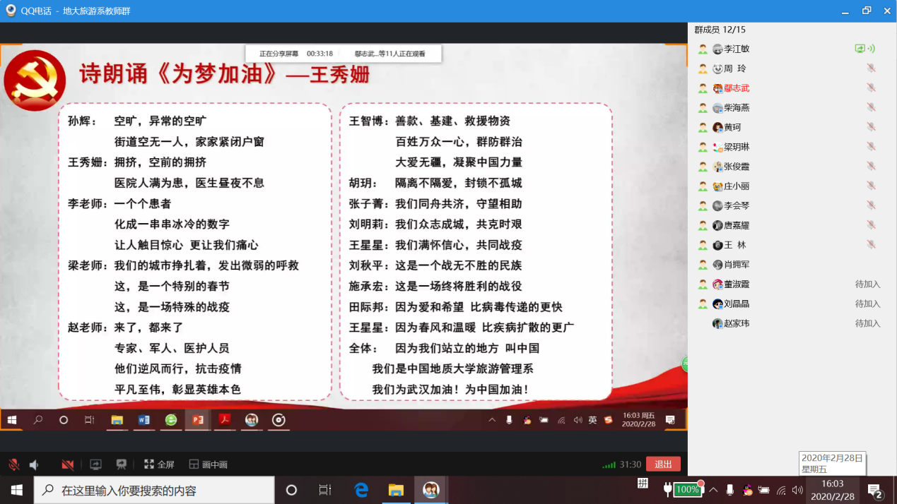 2020年2月28日下午,旅游管理系党支部以QQ电话会议的形式开展了以抗疫为主题的支部主题党日活动,旅游管理系党支部全体党员线上参加此次活动,支部外派挂职党员和群众教师线上列席此次活动。