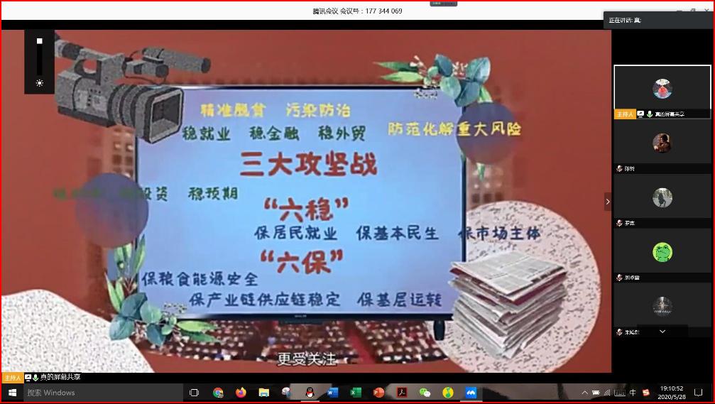 2020年5月21日和5月22日备受瞩目第十三届全国人大三次会议和全国政协第十三届三次会议在北京隆重召开。在两会召开之际,amjs澳金沙门全体学生党支部积极响应党和国家的号召,采用线上会议开展“聚焦全国两会,凝聚决战决胜的中国信心”主题党日活动,各支部党员就两会热点问题各抒己见,交流讨论。