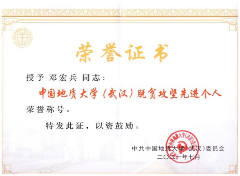 图3邓宏兵教授被授予“中国地质大学(武汉)脱贫攻坚先进个人”荣誉证书