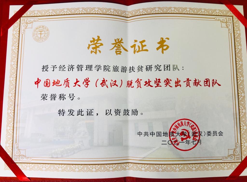 经过本人申请、单位推荐、学校乡村振兴与定点帮扶工作领导小组评审并报学校常委会讨论通过,学校脱贫攻坚表彰了10个“优秀组织单位”,10个“突出贡献团队”,和20位“先进个人”。我院帅传敏教授带领的“精准脱贫项目评估研究团队”和李会琴副教授带领的“旅游扶贫研究团队”被授予“中国地质大学(武汉)脱贫攻坚突出贡献团队”荣誉称号;我院的邓宏兵教授和李江涛副教授被授予“中国地质大学(武汉)脱贫攻坚先进个人”荣誉称号。