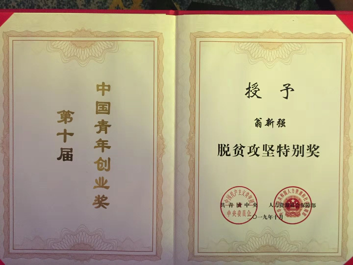 今年5月,第十届“中国青年创业奖”评选表彰活动启动,全国青年创业者踊跃报名,并最终确定20名“中国青年创业奖”获奖者,6名“脱贫攻坚特别奖”获奖者和6名“促进就业特别奖”获奖者。翁新强凭借其多年来坚持在产业扶贫一线的朴实经历,成为本届评选中湖北省的唯一获奖者。