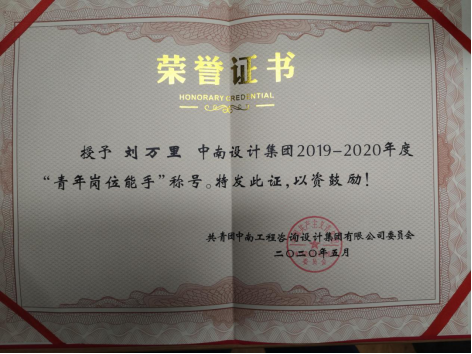 在校期间担任校研究生会办公室主任,获校级社会工作先进个人称号。2016年毕业进入湖北省工程咨询公司工作,现任规划研究部副书记,副主任,经济师,先后荣获2017年度公司标兵称号;2018年度公司标兵称号,同年考核优秀进入公司股东名单;2019年7月获公司技能大赛三等奖,8月收到咸宁市农业农村局好评函,10月获丹江口市发展改革局感谢信;12月被中国地质大学(武汉)聘为校外硕士导师;2019年度公司标兵称号;2019年度公司技能大赛三等奖;2020年5月获集团五四“青年岗位能手”称号。