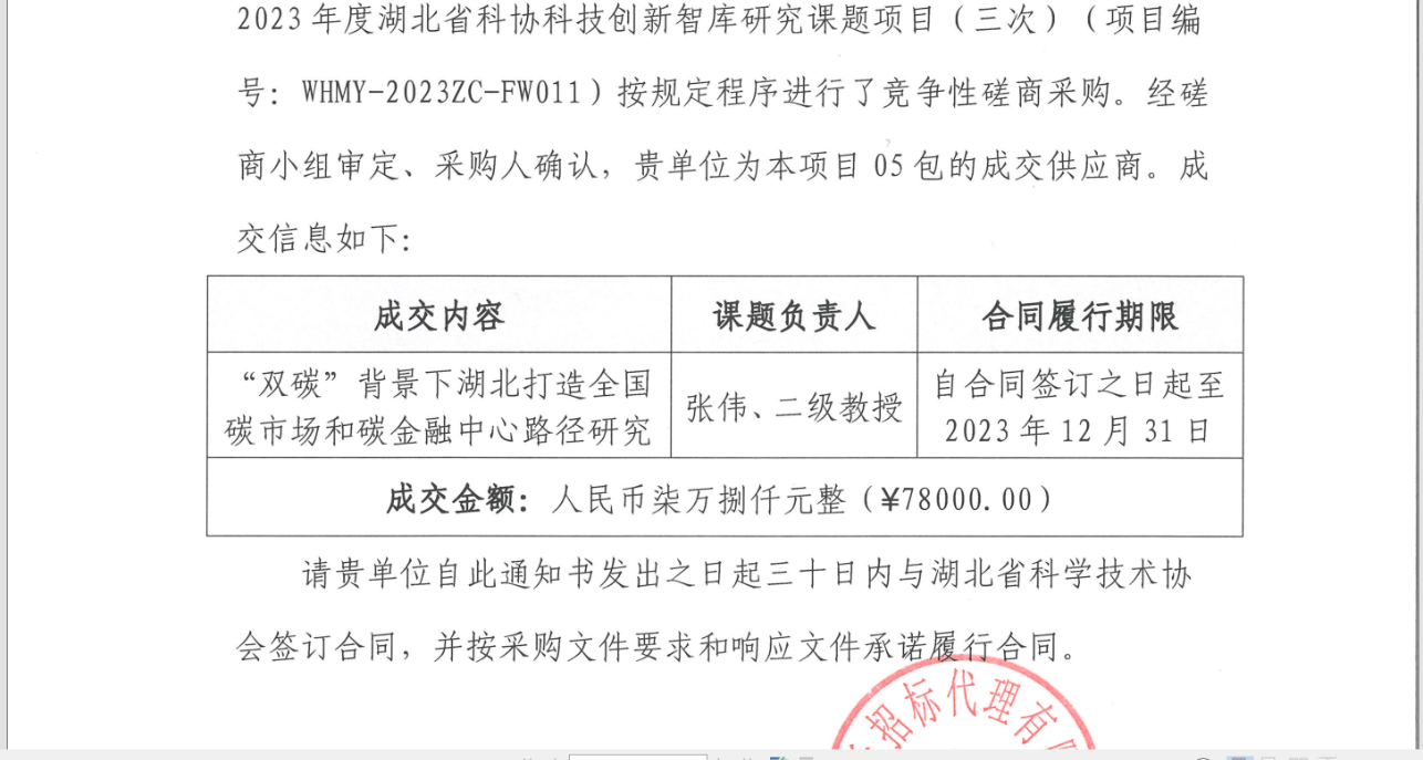 自湖北省科协智库发出研究项目投标通知之后,中国地质大学(武汉)绿色金融团队瞄准第五包《“双碳”背景下湖北打造全国碳市场与碳金融中心路径研究》,反复论证,精心设计,认真准备投标材料,终于于4月23日成功中标。此次成功中标,是对团队实力的一次重要展现。据了解,团队将于近期组织力量开展调查与研究,以便于年底之前提交一份高质量的研究总报告与三份成果专报。
